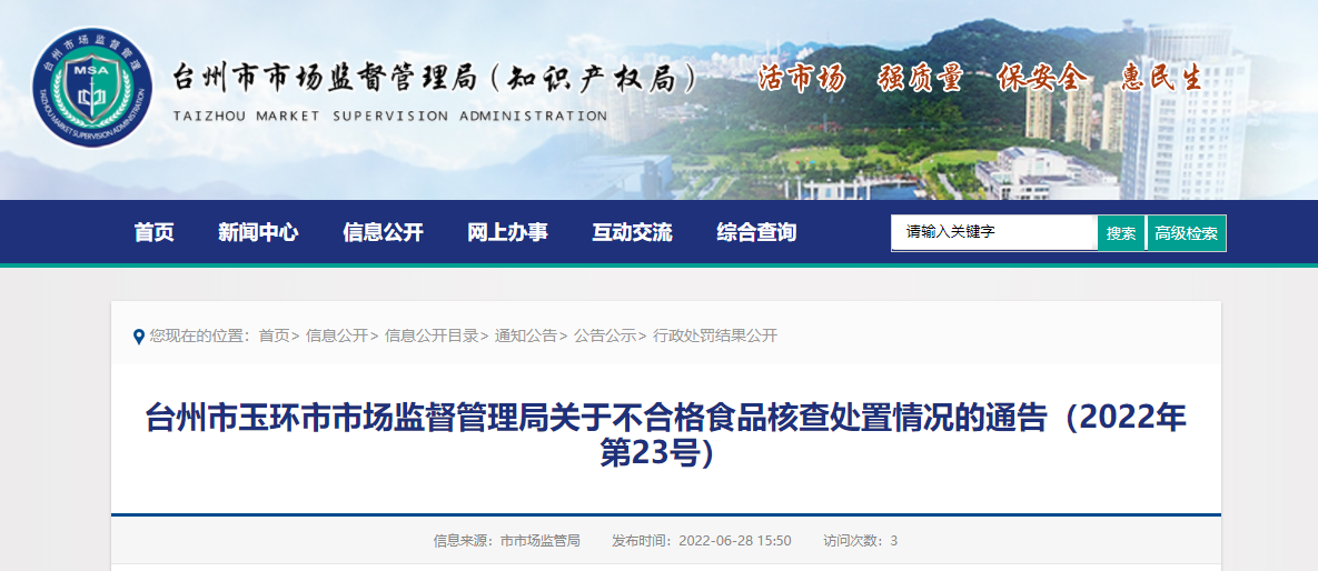 臺州市玉環(huán)市市場監(jiān)督管理局關(guān)于不合格食品核查處置情況的通告(2022年第23號)