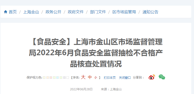 中國質量新聞網(wǎng)訊 近日,上海市金山區(qū)市場監(jiān)督管理局發(fā)布2022年6月食品安全監(jiān)督抽檢不合格產(chǎn)品核查處置情況。