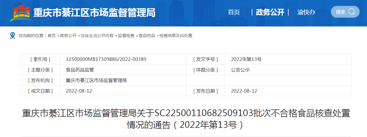 中國質(zhì)量新聞網(wǎng)訊 8月12日,重慶市綦江區(qū)市場監(jiān)督管理局網(wǎng)站發(fā)布關(guān)于SC22500110682509103批次不合格食品核查處置情況的通告(2022年第13號)。