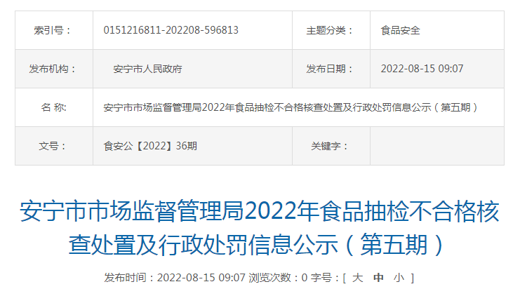 中國質(zhì)量新聞網(wǎng)訊 8月15日,云南省安寧市市場監(jiān)督管理局公示2022年食品抽檢不合格核查處置及行政處罰信息(第五期)。