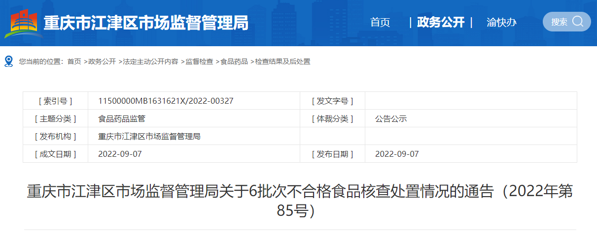 重慶市江津區(qū)市場監(jiān)督管理局關(guān)于6批次不合格食品核查處置情況的通告(2022年第85號)