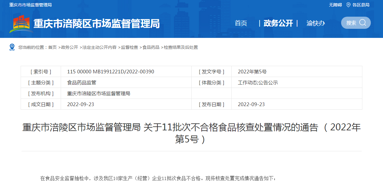 中國質(zhì)量新聞網(wǎng)訊 近日,重慶市涪陵區(qū)市場監(jiān)管局發(fā)布關(guān)于11批次不合格食品核查處置情況的通告(2022年第5號),涉及陸俊經(jīng)營的牛蛙。