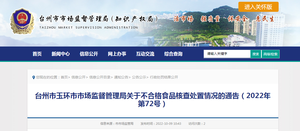 臺州市玉環(huán)市市場監(jiān)督管理局關于不合格食品核查處置情況的通告(2022年第72號)
