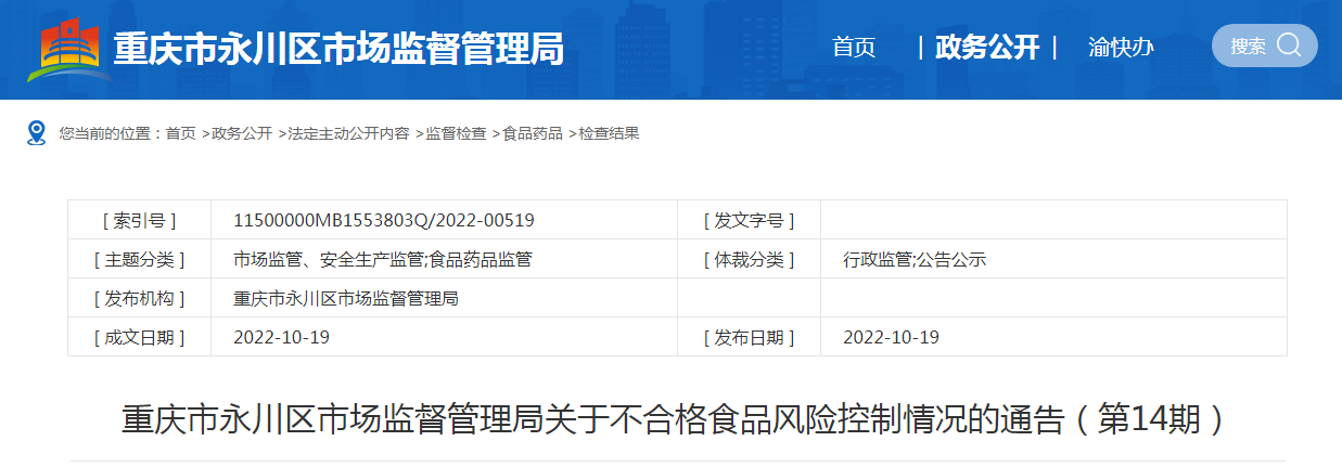 重慶市永川區(qū)市場監(jiān)督管理局關于不合格食品風險控制情況的通告(第14期)