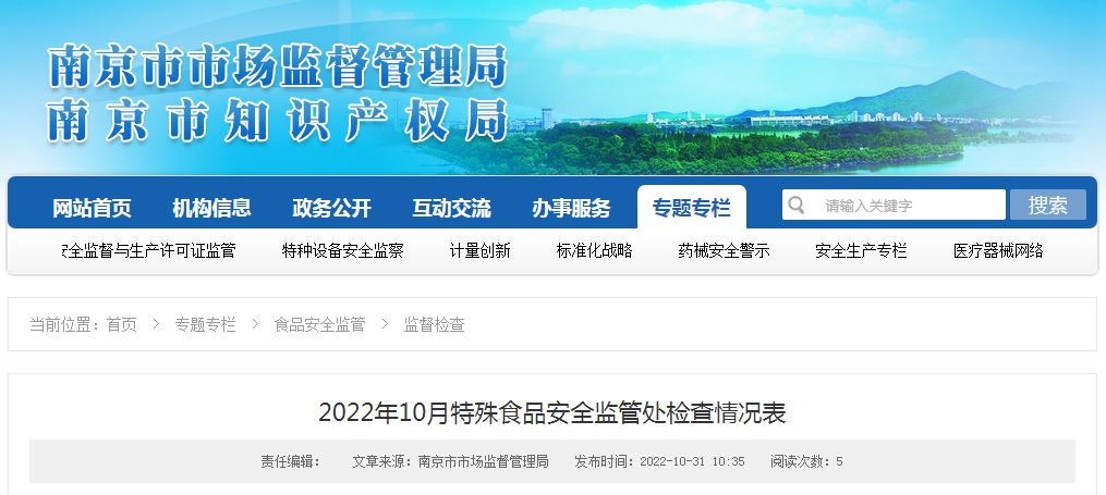 中國質(zhì)量新聞網(wǎng)訊 10月31日,南京市市場監(jiān)督管理局網(wǎng)站發(fā)布2022年10月特殊食品安全監(jiān)管處檢查情況表。