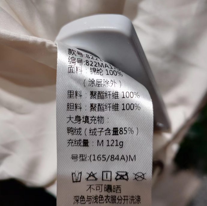 一看:在選購羽絨服時,看產(chǎn)品合格證及產(chǎn)品整體外觀。首先看產(chǎn)品合格證上的執(zhí)行標準,執(zhí)行標準標注為GB/T 14272—2021的羽絨服裝產(chǎn)品有著較高的質(zhì)量水平。然后看羽絨種類、絨子含量、充絨量。目前羽絨填充物一般為鵝絨、鴨絨。鵝絨的產(chǎn)量遠低于鴨絨,相同絨子含量的羽絨,以鵝絨為填充物的羽絨服裝價格明顯高于鴨絨羽絨服。絨子含量與充絨量對羽絨服的保暖性有顯著影響,絨子含量越高,蓬松度通常越高,在同等條件下其保暖性越好;增加充絨量可以明顯提升服裝的保暖性,但當填充量達到一定限度后,保暖性能會隨填充量的增加而降低。另外,嬰幼兒羽絨服安全類別應標注“GB 31701嬰幼兒用品”,檢查吊牌和標識中是否有企業(yè)名稱與聯(lián)系方式。