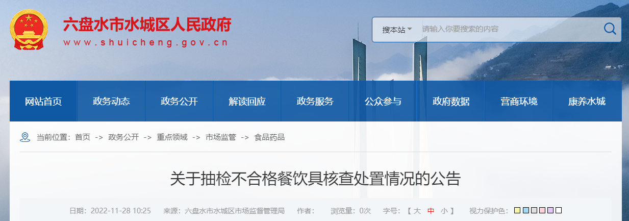 中國質(zhì)量新聞網(wǎng)訊 11月28日,貴州省六盤水市水城區(qū)人民政府網(wǎng)站發(fā)布關(guān)于抽檢不合格餐飲具核查處置情況的公告。