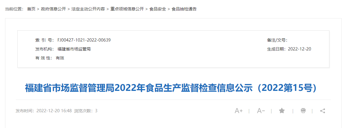 中國質(zhì)量新聞網(wǎng)訊 12月20日,福建省市場監(jiān)督管理局網(wǎng)站公示2022年食品生產(chǎn)監(jiān)督檢查信息(2022第15號)。