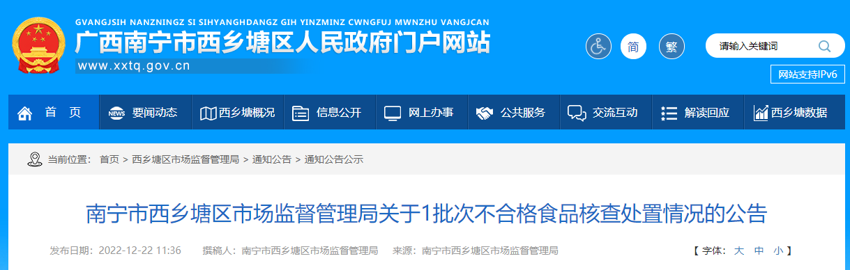 南寧市西鄉(xiāng)塘區(qū)市場監(jiān)督管理局關(guān)于1批次不合格食品核查處置情況的公告