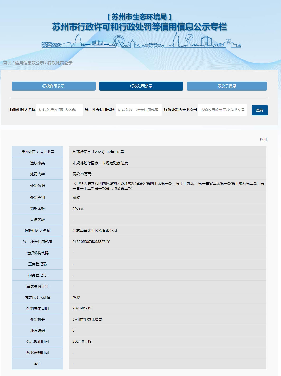 信息顯示,江蘇華昌化工股份有限公司的違法事實為“未規(guī)范貯存固廢、未規(guī)范貯存危廢”。依據《中華人民共和國固體廢物污染環(huán)境防治法》第四十條第一款、第七十九條、第一百零二條第一款第十項及第二款、第一百一十二條第一款第六項及第二款,蘇州市生態(tài)環(huán)境局對江蘇華昌化工股份有限公司處以罰款29萬元。
