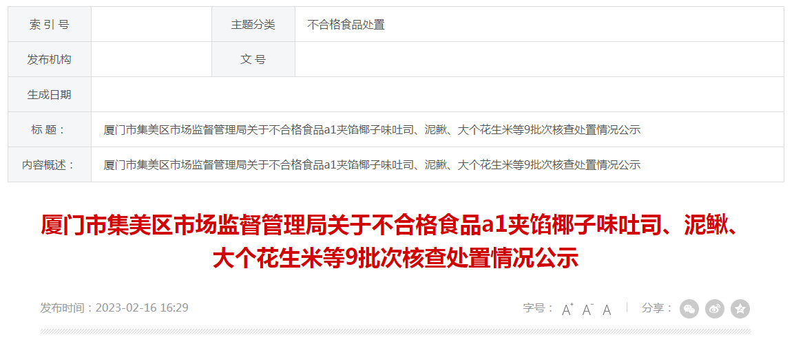 中國質(zhì)量新聞網(wǎng)訊 近日,廈門市集美區(qū)市場(chǎng)監(jiān)督管理局公示a1夾餡椰子味吐司、泥鰍、長豆等9批次不合格食品核查處置情況。其中,對(duì)不合格長豆核查處置情況如下: