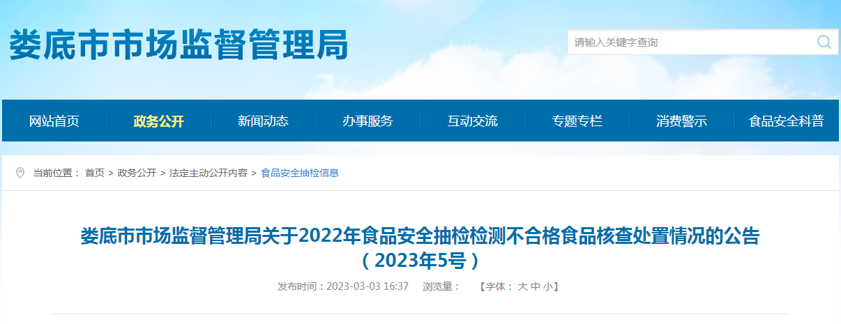 婁底市市場(chǎng)監(jiān)督管理局關(guān)于2022年食品安全抽檢檢測(cè)不合格食品核查處置情況的公告(2023年5號(hào))
