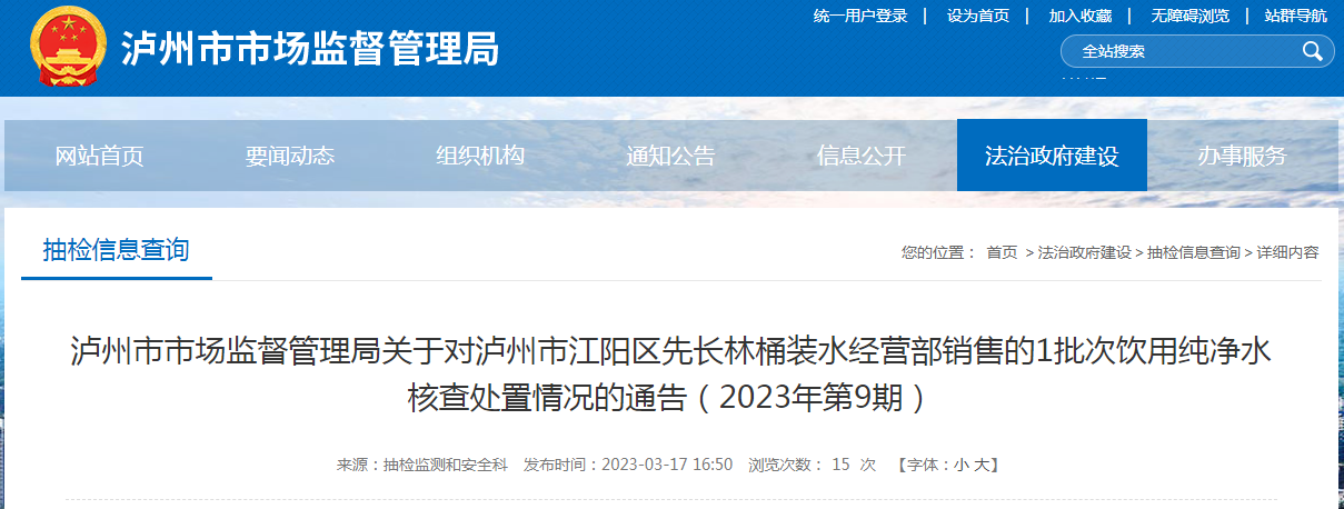 四川省市場監(jiān)督管理局發(fā)布的《關(guān)于68批次食品抽檢不合格情況的通告(2023年第1號)》,涉及瀘州市江陽區(qū)先長林桶裝水經(jīng)營部銷售的1批次飲用純凈水不合格?,F(xiàn)將該批次不合格產(chǎn)品的核查處置情況通告如下。