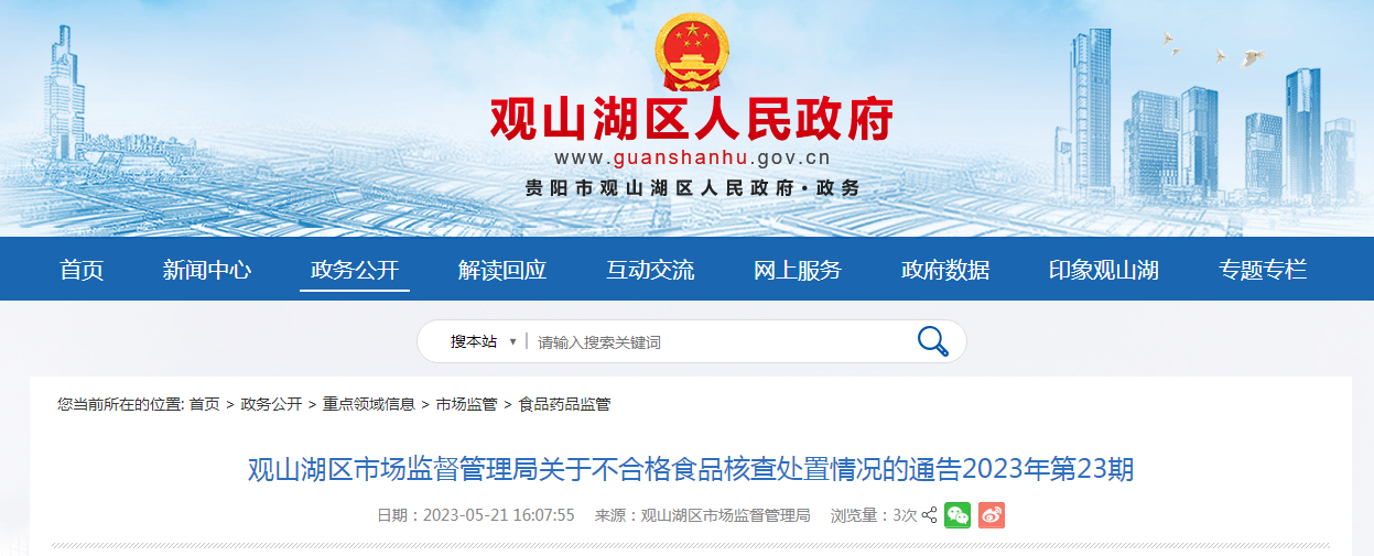 中國(guó)質(zhì)量新聞網(wǎng)訊 近日,貴陽(yáng)市觀山湖區(qū)市場(chǎng)監(jiān)督管理局發(fā)布關(guān)于不合格食品核查處置情況的通告(2023年第23期)。