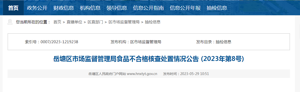 中國質(zhì)量新聞網(wǎng)訊 5月29日,湖南省湘潭市岳塘區(qū)市場監(jiān)督管理局發(fā)布食品不合格核查處置情況公告(2023年第8號(hào))。