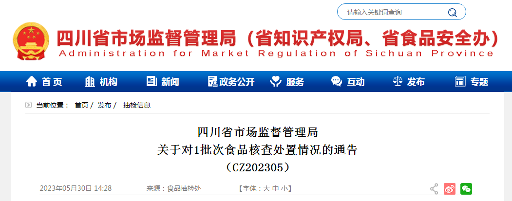 四川省市場監(jiān)督管理局關(guān)于對1批次食品核查處置情況的通告