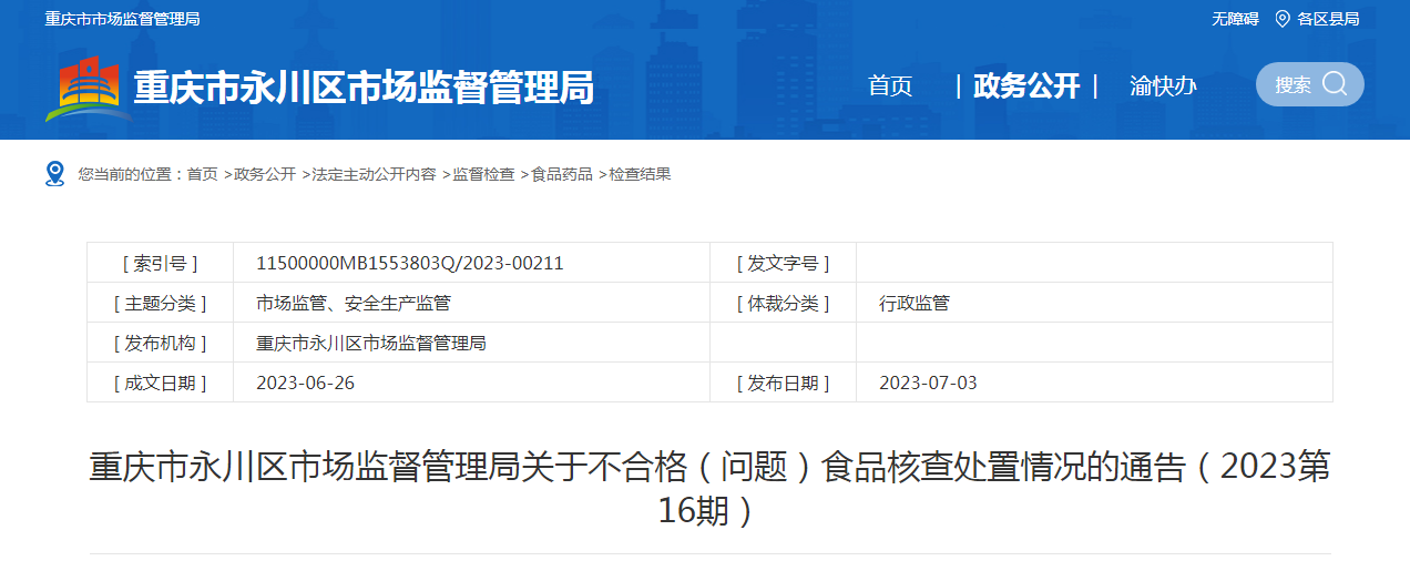 重慶市永川區(qū)市場監(jiān)督管理局關(guān)于不合格(問題)食品風(fēng)險控制情況的通告(2023第16期)