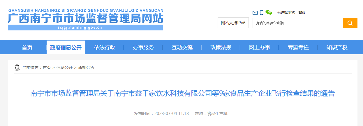 中國質(zhì)量新聞網(wǎng)訊 7月4日,南寧市市場監(jiān)督管理局網(wǎng)站發(fā)布關(guān)于南寧市益千家飲水科技有限公司等9家食品生產(chǎn)企業(yè)飛行檢查結(jié)果的通告。本次檢查內(nèi)容包括食品生產(chǎn)者資質(zhì)、生產(chǎn)環(huán)境條件、進(jìn)貨查驗(yàn)、生產(chǎn)過程控制等14項(xiàng)內(nèi)容。