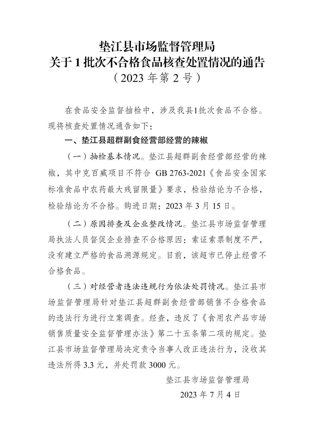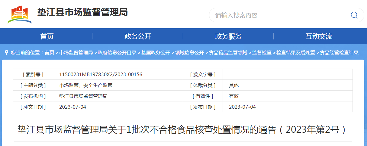 中國質(zhì)量新聞網(wǎng)訊 7月4日,重慶市墊江縣市場監(jiān)督管理局發(fā)布關(guān)于1批次不合格食品核查處置情況的通告(2023年第2號)。