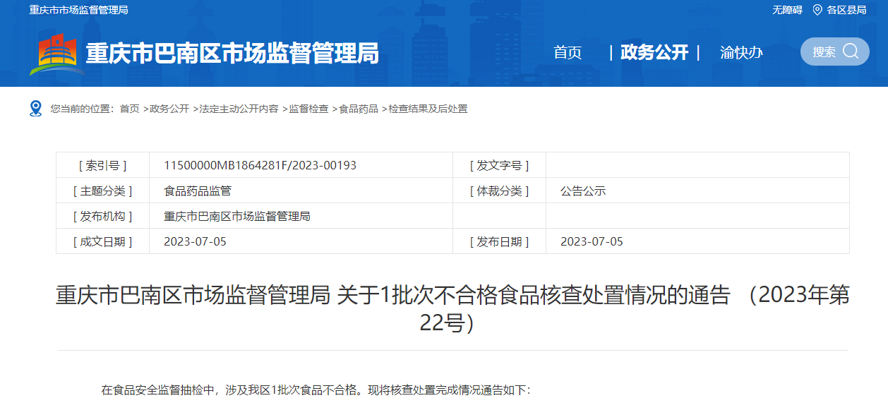 重慶市巴南區(qū)市場(chǎng)監(jiān)督管理局關(guān)于1批次不合格食品核查處置情況的通告(2023年第22號(hào))