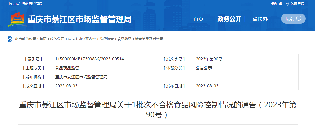 重慶市綦江區(qū)市場(chǎng)監(jiān)督管理局關(guān)于1批次不合格食品風(fēng)險(xiǎn)控制情況的通告(2023年第90號(hào))