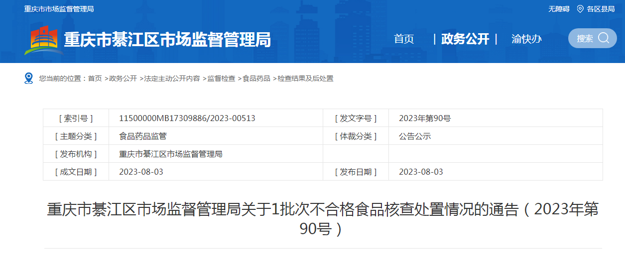 重慶市綦江區(qū)市場(chǎng)監(jiān)督管理局關(guān)于1批次不合格食品核查處置情況的通告(2023年第90號(hào))