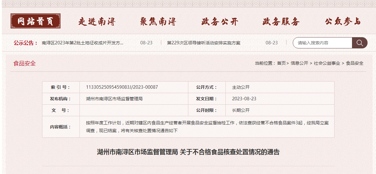 湖州市南潯區(qū)市場監(jiān)督管理局關(guān)于不合格食品核查處置情況的通告
