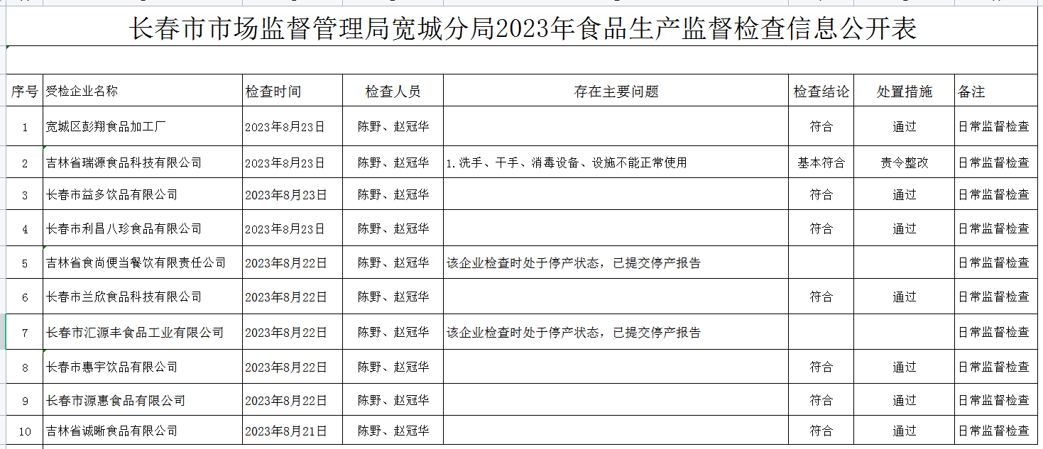 中國質(zhì)量新聞網(wǎng)訊 近日,長春市市場監(jiān)督管理局寬城分局發(fā)布2023年食品生產(chǎn)監(jiān)督檢查信息公開表。具體信息如下: