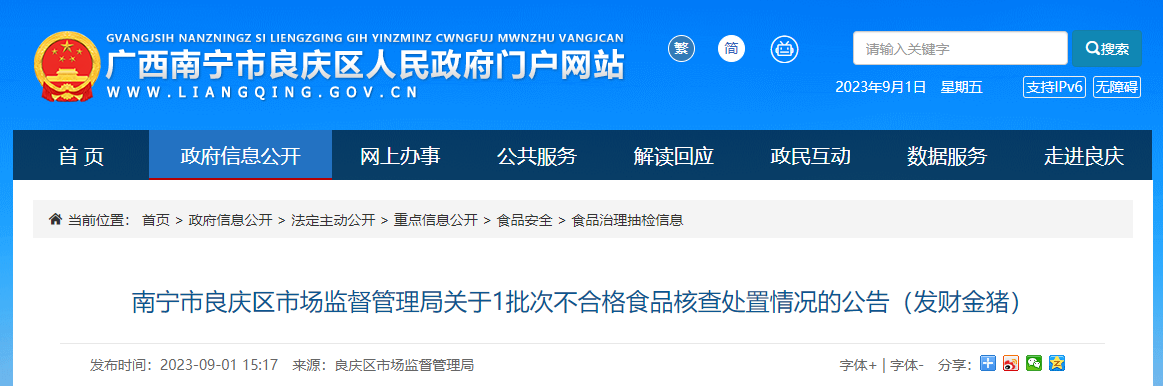 南寧市良慶區(qū)市場監(jiān)督管理局關(guān)于1批次不合格食品核查處置情況的公告(發(fā)財金豬)