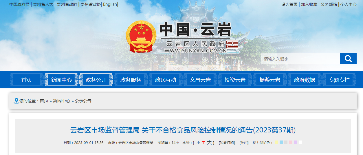 中國質量新聞網訊 近日,貴陽市云巖區(qū)市場監(jiān)督管理局發(fā)布關于不合格食品風險控制情況的通告(2023第37期)。