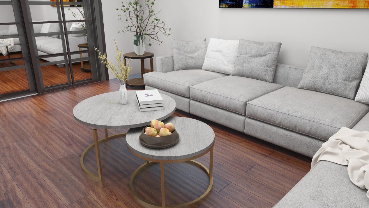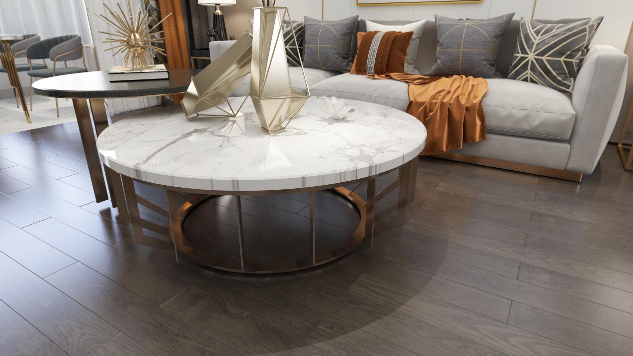 在地板的選擇上,原木色、灰色系的久盛山核桃地板都是很好的選擇,簡約雅致的木地板彰顯質(zhì)感,加上金屬擺件、地毯等軟裝,帶來輕奢質(zhì)感的家居空間。