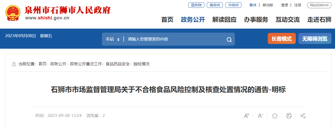 中國(guó)質(zhì)量新聞網(wǎng)訊 9月8日,福建省石獅市市場(chǎng)監(jiān)督管理局發(fā)布關(guān)于不合格食品風(fēng)險(xiǎn)控制及核查處置情況的通告-明標(biāo)。