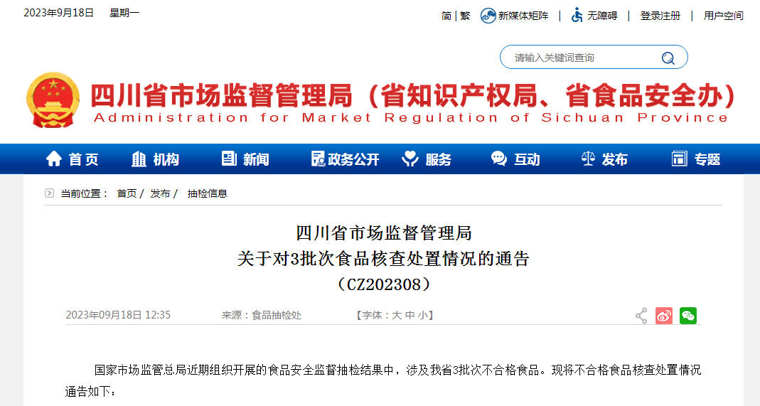 四川省市場(chǎng)監(jiān)督管理局關(guān)于對(duì)3批次食品核查處置情況的通告