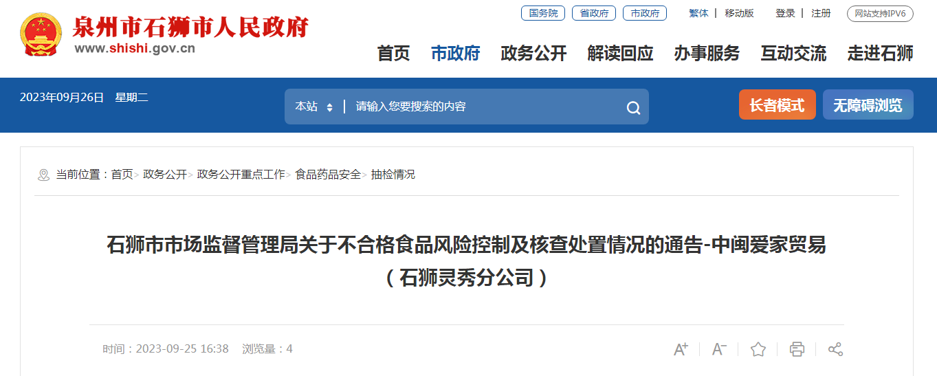 石獅市市場監(jiān)督管理局關(guān)于不合格食品風(fēng)險(xiǎn)控制及核查處置情況的通告-中閩愛家貿(mào)易(石獅靈秀分公司)