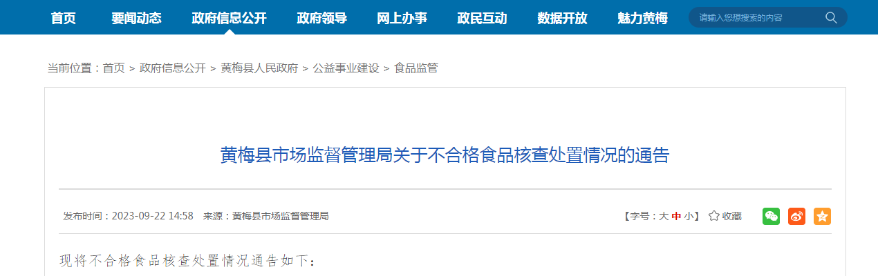 黃梅縣市場監(jiān)督管理局關(guān)于不合格食品核查處置情況的通告