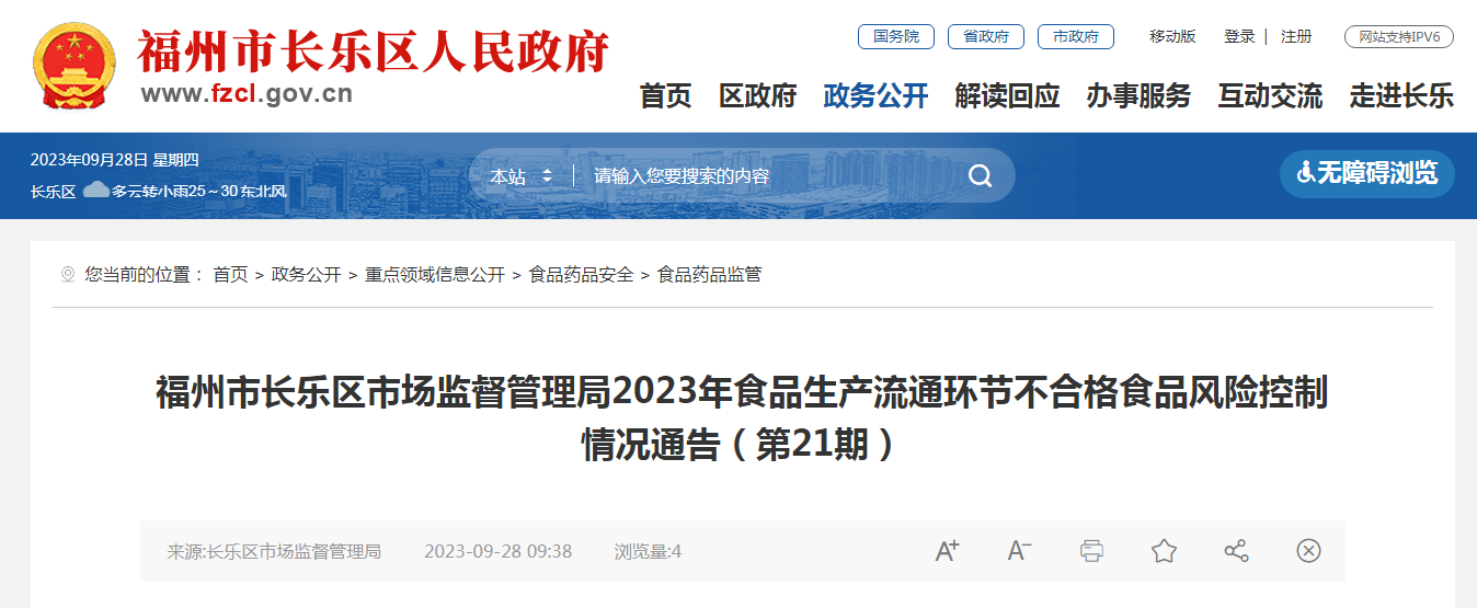 福州市長(zhǎng)樂(lè)區(qū)市場(chǎng)監(jiān)督管理局2023年食品生產(chǎn)流通環(huán)節(jié)不合格食品風(fēng)險(xiǎn)控制情況通告(第21期)