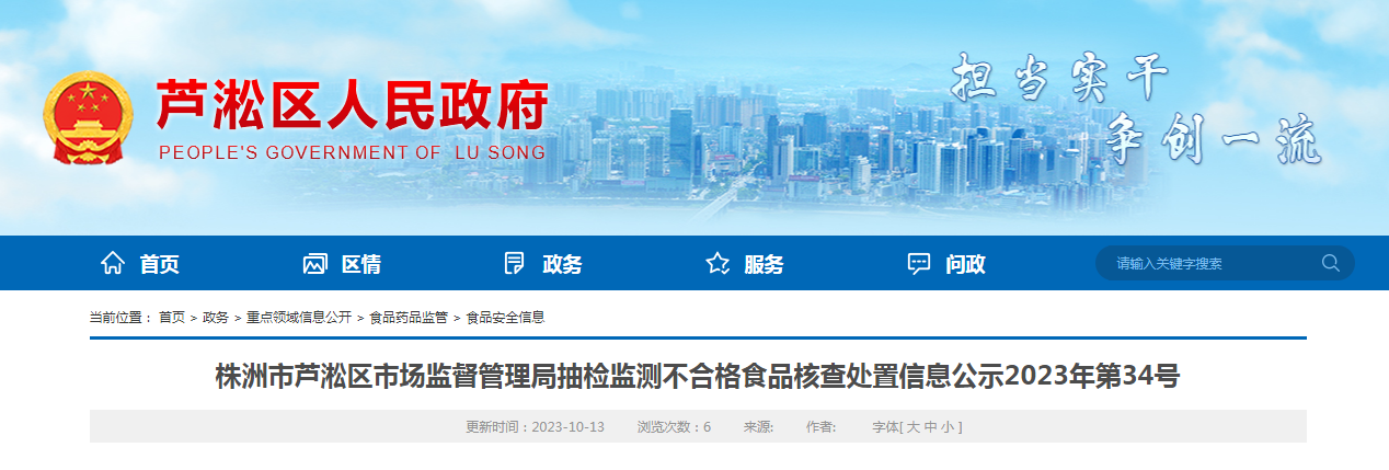 株洲市蘆淞區(qū)市場監(jiān)督管理局抽檢監(jiān)測不合格食品核查處置信息公示 2023年第34號