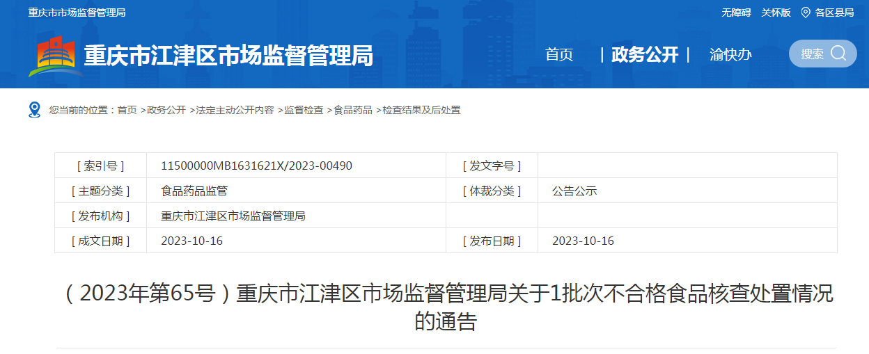 重慶市江津區(qū)市場監(jiān)督管理局關于1批次不合格食品核查處置情況的通告(2023年第65號)