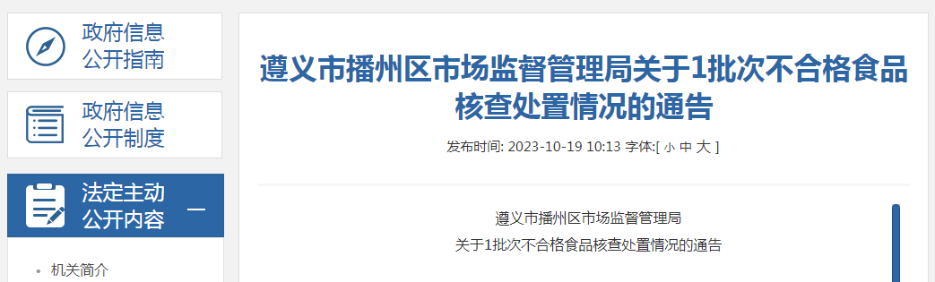 遵義市播州區(qū)市場監(jiān)督管理局關(guān)于1批次不合格食品核查處置情況的通告