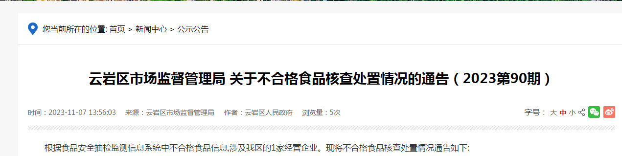 云巖區(qū)市場(chǎng)監(jiān)督管理局關(guān)于不合格食品核查處置情況的通告(2023第90期)