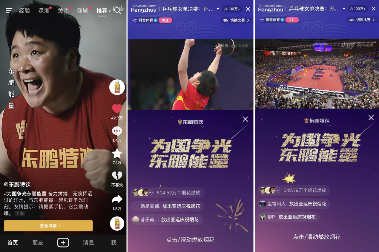 作為杭州亞運(yùn)會(huì)官方指定功能飲料,東鵬特飲特別聯(lián)手杭州亞運(yùn)會(huì)抖音賽事直播,首創(chuàng)“奪冠煙花”限定特效,在中國(guó)隊(duì)奪勝時(shí)刻誠(chéng)邀全民一起“點(diǎn)燃”奪冠煙花,共同見(jiàn)證中國(guó)健兒“為國(guó)爭(zhēng)光”的高光時(shí)刻。此外,東鵬特飲打造了一支《為國(guó)爭(zhēng)光 東鵬能量》創(chuàng)新TVC,并將其調(diào)制成“震動(dòng)模式”,用體感“震醒”觀眾,創(chuàng)意十足,給用戶留下了深刻印象。