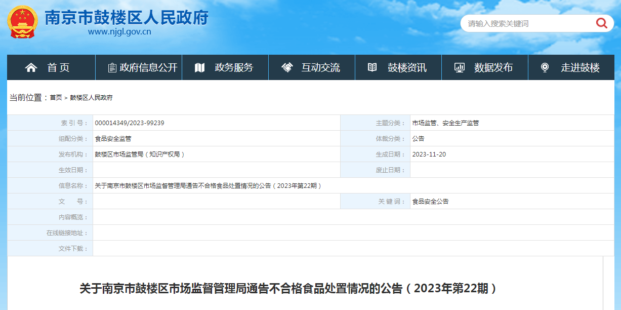 關于南京市鼓樓區(qū)市場監(jiān)督管理局通告不合格食品處置情況的公告(2023年第22期)