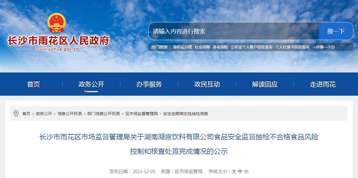 長(zhǎng)沙市雨花區(qū)市場(chǎng)監(jiān)督管理局關(guān)于湖南凝露飲料有限公司食品安全監(jiān)督抽檢不合格食品風(fēng)險(xiǎn)控制和核查處置完成情況的公示