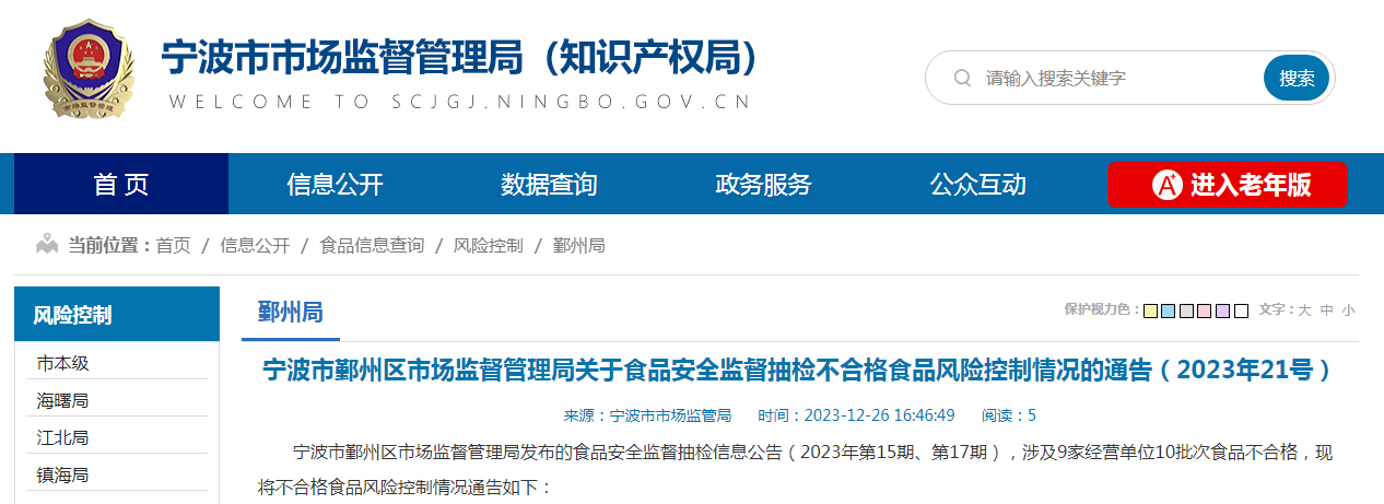 寧波市鄞州區(qū)市場監(jiān)督管理局關(guān)于食品安全監(jiān)督抽檢不合格食品風(fēng)險控制情況的通告(2023年21號)