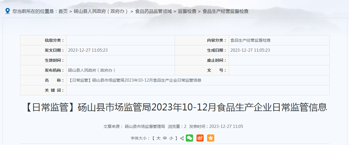 【日常監(jiān)管】碭山縣市場(chǎng)監(jiān)管局2023年10-12月食品生產(chǎn)企業(yè)日常監(jiān)管信息