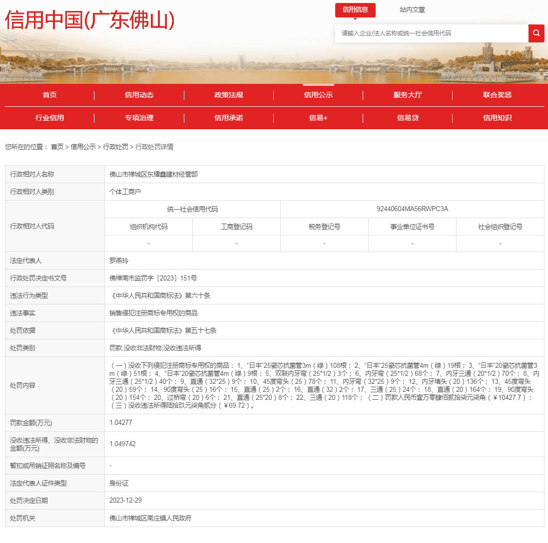 佛山市禪城區(qū)東耀鑫建材經(jīng)營(yíng)部銷售侵犯注冊(cè)商標(biāo)專用權(quán)的商品案