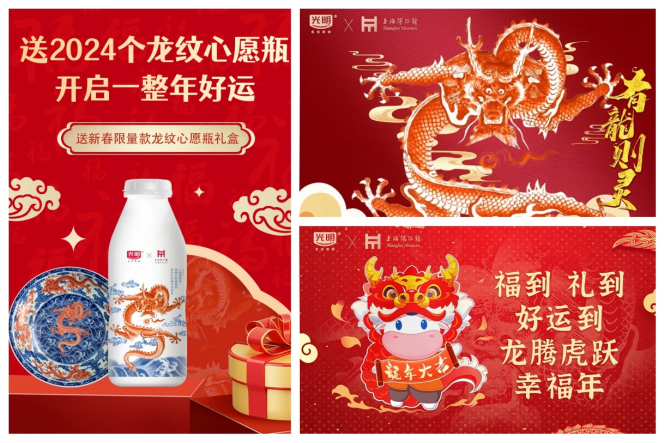 本次送出的龍紋心愿瓶是由光明乳業(yè)與上海博物館聯(lián)名打造新春限量款新品。新品瓶身龍紋包裝的設(shè)計靈感,來自上海博物館藏的清雍正景德鎮(zhèn)窯青花紅彩海水龍紋盤。進入龍年,希望每個消費者的生活都像光明龍紋心愿瓶上的那條正面紅色五爪盤龍,永遠追逐一顆紅色火焰珠,奔赴光明未來。