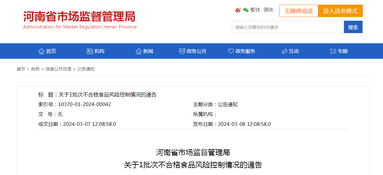 河南省市場(chǎng)監(jiān)督管理局關(guān)于1批次不合格食品風(fēng)險(xiǎn)控制情況的通告