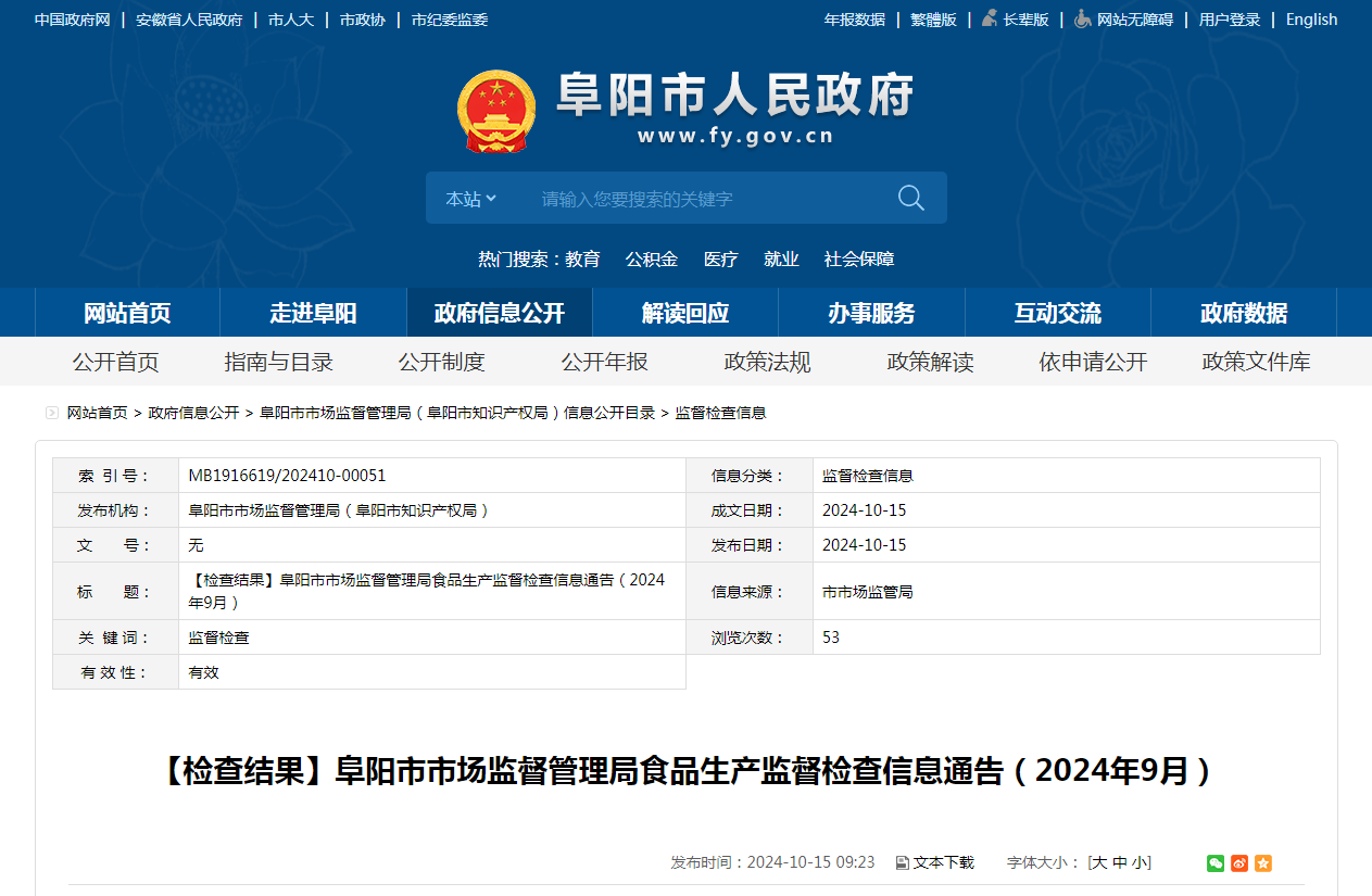 【檢查結(jié)果】阜陽市市場(chǎng)監(jiān)督管理局食品生產(chǎn)監(jiān)督檢查信息通告(2024年9月)