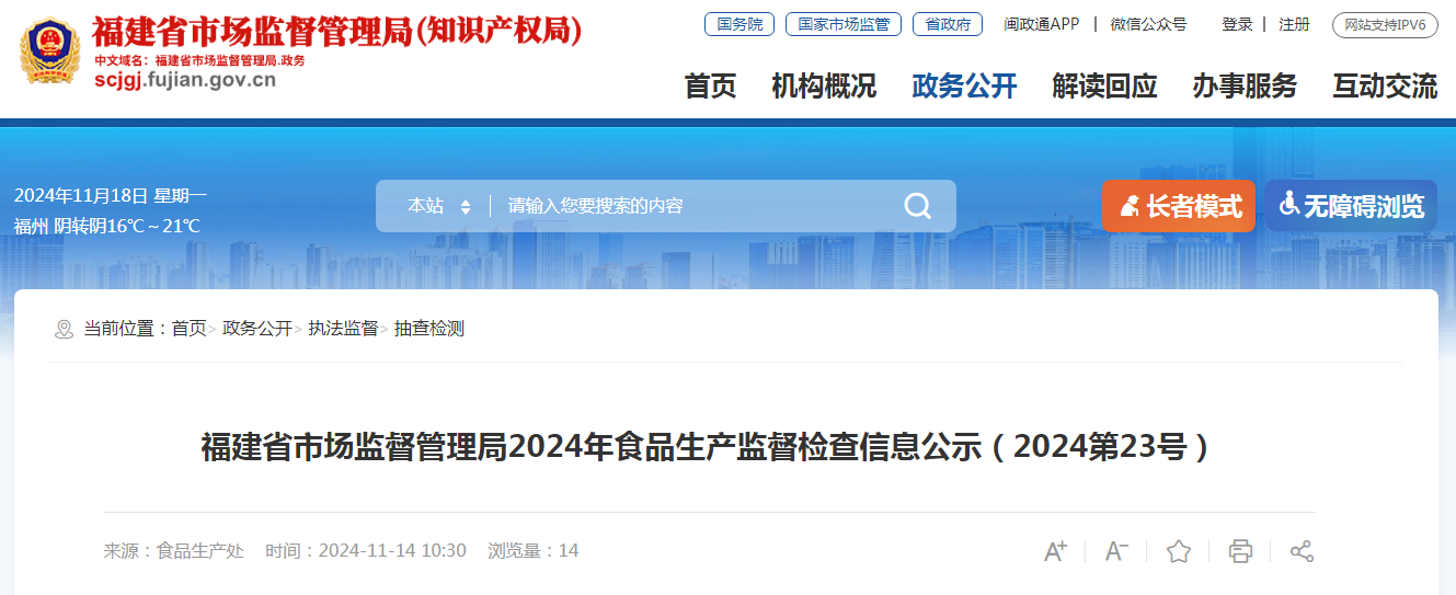 福建省市場監(jiān)督管理局2024年食品生產(chǎn)監(jiān)督檢查信息公示(2024第23號)